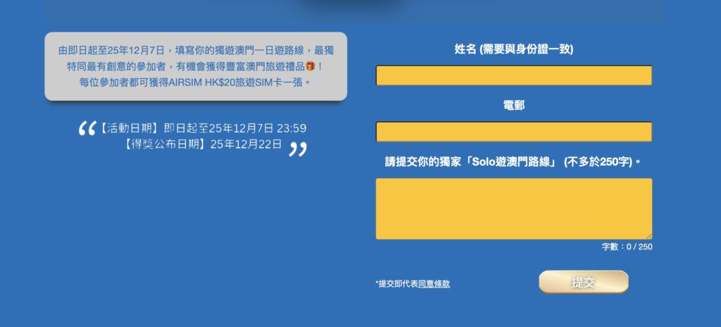 Table of Contents 簡介主要工作截圖 簡介 澳門特別行政區政府旅遊局推出「獨遊澳門,說走就走」活動,此登陸頁是FlydayHK為澳門特別行政區旅遊局設計及運行,網頁包括了IG Reel自動讀取,表格自動連結Google form功能等,此網頁亦以最新frontend技術製作,以提高穩定性、可閱讀性及載入速度。 主要工作 根據要求製作登陸頁,同時為頁面添加互動元素及確保手機端能正常運作。 截圖 (互動元素) (設計扇形走馬燈) (連接Google Form) (footer) 跳到登陸頁 相關內容 好奇發現美: Landing page for Flyday.hk 遊牧巿集2020 EVA Air Landing Page By : label Tags: Google API Google Form js Landing Page PHP React